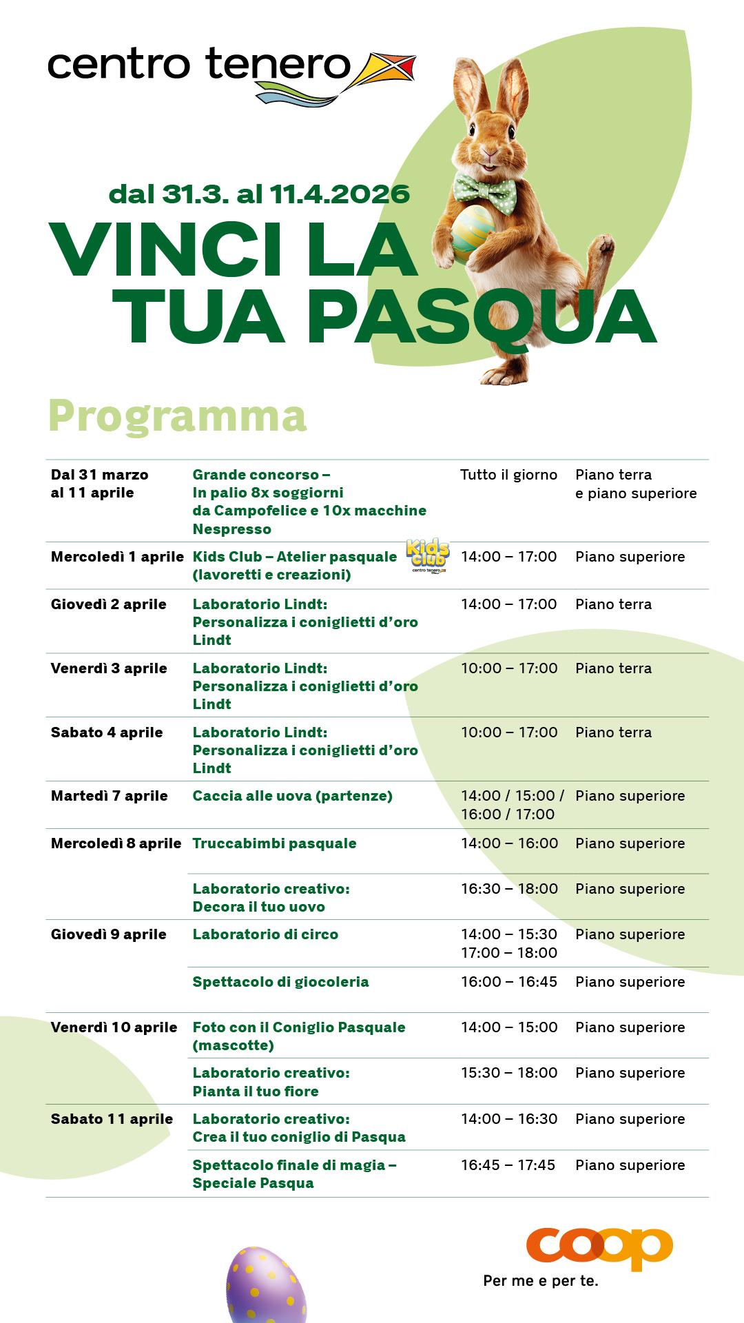 Da martedì 31 marzo a sabato 11 aprile, Centro Tenero festeggia la Pasqua con tante iniziative per tutta la famiglia. Per l’occasione, il Centro si veste a tema con coniglietti, scenografie pasquali e colorate composizioni di palloncini a forma di carote, per un’atmosfera allegra e primaverile.