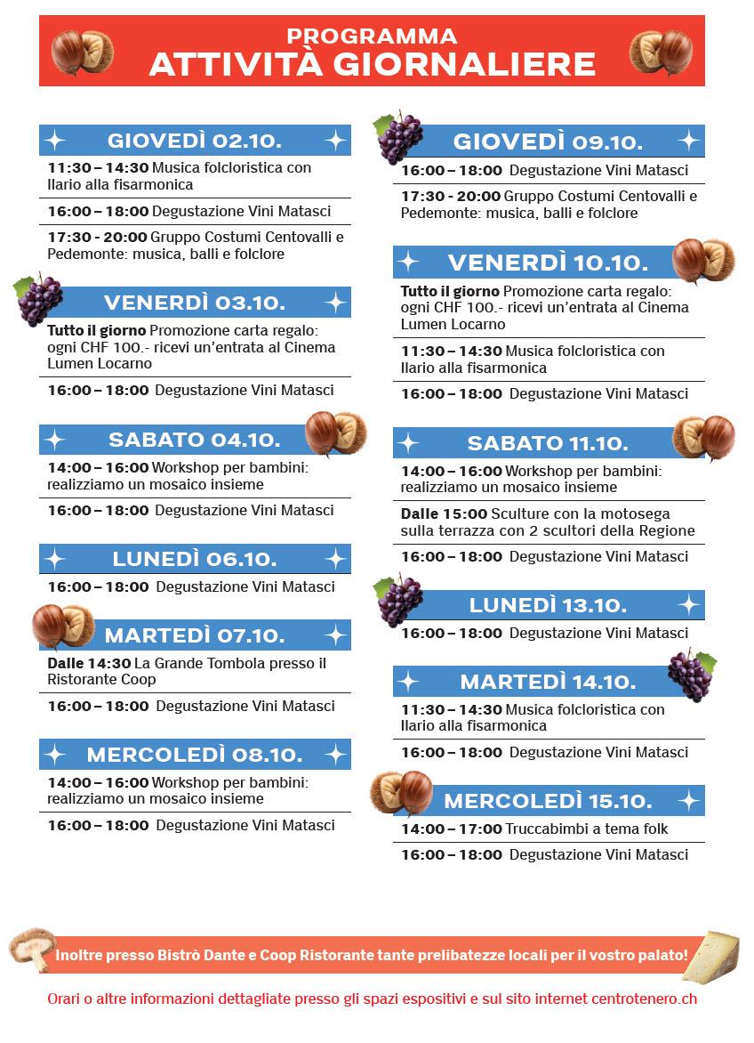 Dal 2 al 15 ottobre il Centro Tenero propone il tradizionale appuntamento autunnale del TENERO FOLK. Costumi, usanze, folclore e tradizioni della nostra Regione sono il tema centrale dell'evento. In collaborazione con il Gruppo Costumi Centovalli e Pedemonte, con Fattoria Ponzio e i suoi trattori d'epoca, "Boccia al Bosco" della Verzasca, con Ilario Garbani e con Matasci Vini e la sua esposizione della cultura vinicola; nel Centro si respirerà aria di festa! Altra novità, l'area didattica dedicata alla biodiversità in un ambiente urbano. La mostra comprende uno stand speciale della Fondazione Bolle di Magadino. Inoltre in esclusiva, al piano superiore, si potrà osservare con i propri occhi, giorno per giorno, la realizzazione di un mosaico da parte degli studenti del sopraceneri della SPAI.